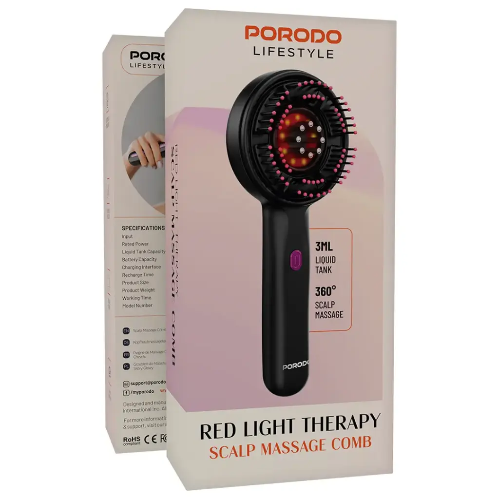 Porodo Lifestyle Red Light Therapy Scalp Massage Comb is used to provide a relaxing and rejuvenating experience for the scalp while providing red-light therapy for stimulating hair growth. The 360° scalp massage ensures every scalp is thoroughly massaged. Having adjustable massage modes allows the user to change massage intensity according to preference. Oil application is maximized during the massage, nourishing the scalp. It has a 3mL liquid tank, enabling the comb to be used for multiple treatments. For safety an auto shut-off feature turns off the device after the set time to prevent overuse. The Type-C charging interface allows quick charging. The 1400mAh battery capacity offers 40 minutes of operation after a single charge.